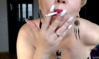 Gorgeous Russian mom smokes in a fur adorn and dominates))